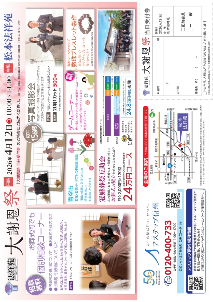 日頃よりの感謝の気持ちを込めて、 4月12日(日)に 【松本法祥苑大謝恩祭】を開催します。